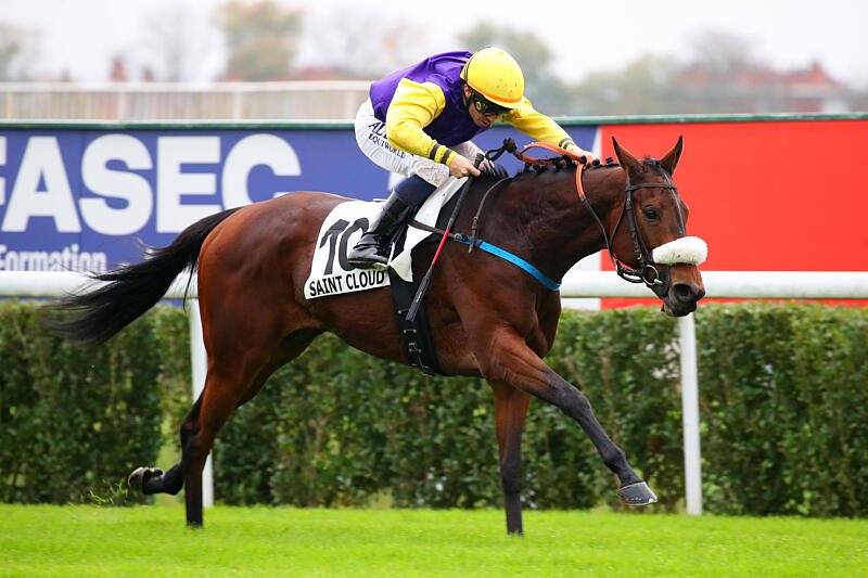 Jesuba, la fille de Anastasia lorsqu'elle a remporté le Prix Glorieuse (Gr.2 AQPS) à Saint Cloud sous la selle de Mickael Barzalona.