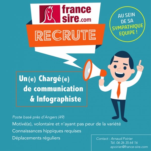 Pour répondre à la recrudescence d'activité, France Sire se lance à la quête de nouveaux talents ! L'équipe cherche en effet à se renforcer d'un(e) chargé(e) de communication & infographiste, prêt à se lancer dans l'aventure. Il faut savoir se servir de ses 10 doigts, aimer les chevaux, avoir le sens de l'autonomie et de l'initiative, ne pas avoir peur du boulot, et aimer voyager et faire plein de choses différentes tous les jours ! Le poste est basé près d'Angers.