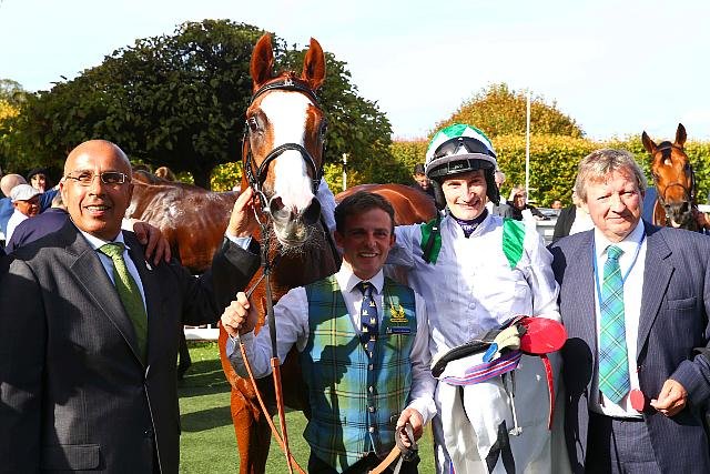 Dubai Mile avec son propriétaire Ahmad Al Shaikh, son jockey Daniel Muscutt, et son entraîneur Mark Johnston (aprh)