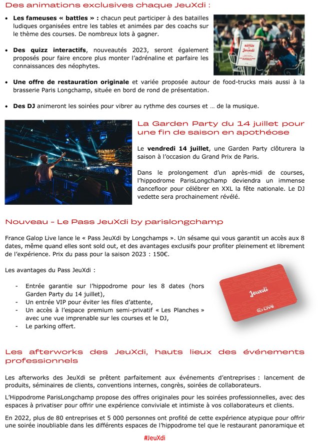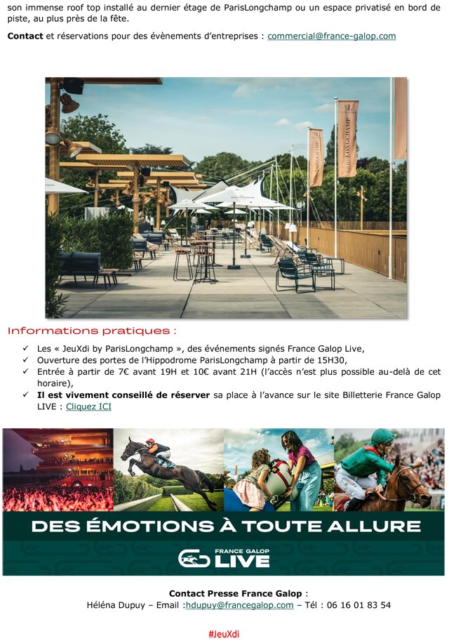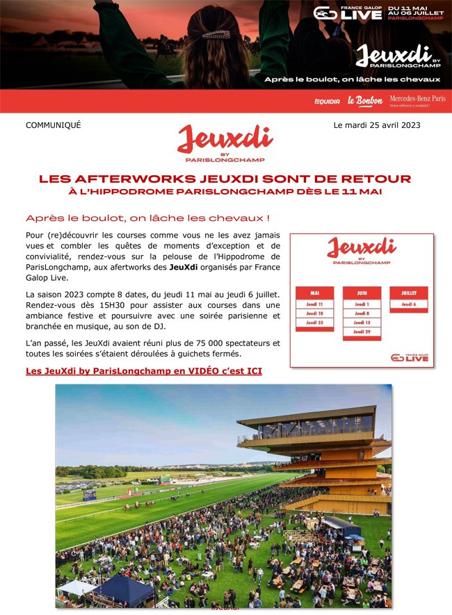 Spectaculaire réussite de France Galop en terme d'attrait du public, les JeuXdi de ParisLongchamp marquent leur retour pour 8 dates au 1e semestre, à partir du 11 mai.