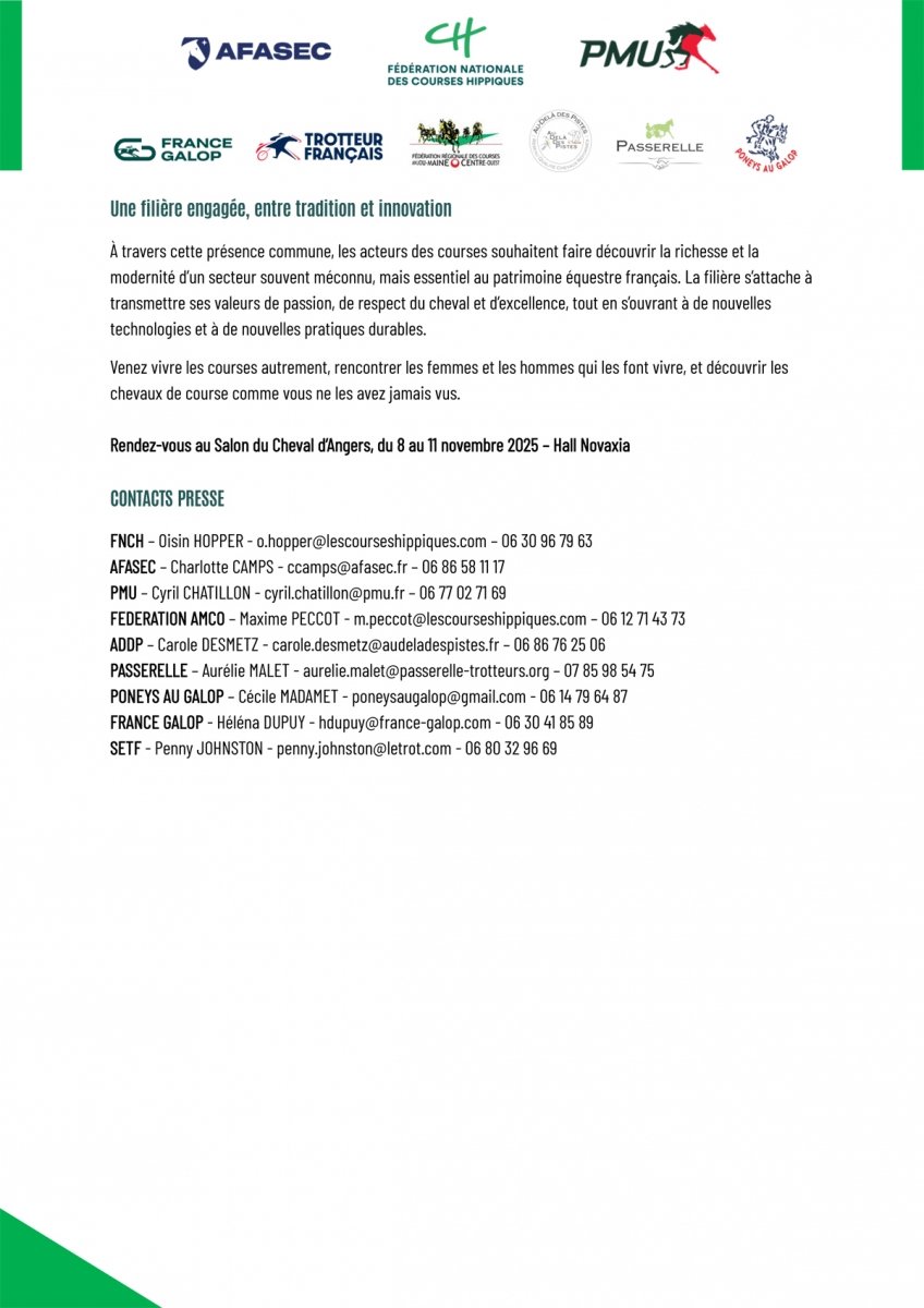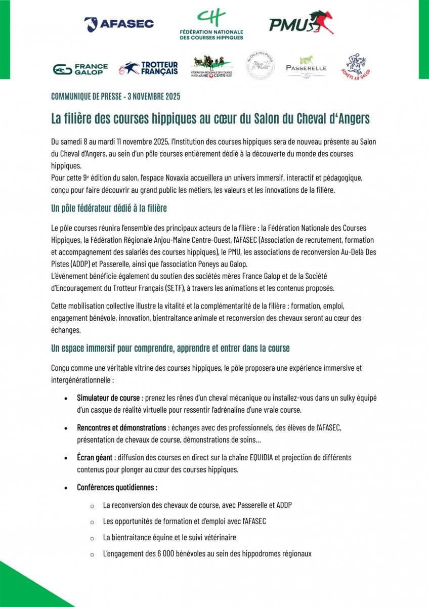 Trop souvent absent de la planète cheval en général, la filière courses, sous l'impulsion de la Fédération Nationale des Courses Hippiques, met le paquet pour se rendre incontournable au Salon du Cheval d'Angers, qui tiendra sa 9e édition sur 4 jours du 8 au 11 novembre au parc des expositions, d'ailleurs à 2 pas de l'hippodrome.