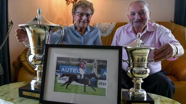 Robert Gashe-Luc et sa femme Monique posant fièrement avec les trophées du Grand Steeple-Chase de Paris