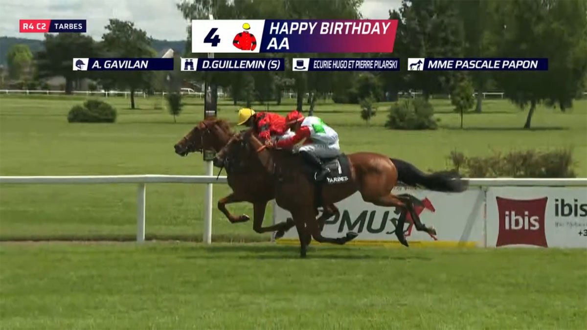 Dans la foulée de son succès obtenu à la mi-mai, à Dax, dans le Prix Dunamis, Happy Birthday est de nouveau parvenue à s'immiscer sur la première marche du podium, elle qui est en effet ressortie victorieuse du Critérium des Jeunes à 12.5%, à Tarbes, jeudi 05 juin, sous la selle d'Alexandre Gavilan. Rapidement pointée en tête du peloton, cette pensionnaire de Didier Guillemin a bien accéléré sitôt l'entrée de la dernière ligne droite, pour finalement conserver le meilleur jusqu'au bout, malgré la très bonne fin de course de Charlie de la Brunie (Clovis du Berlais). Cette dernière a en effet dû se contenter de la deuxième place, à seulement une tête de la lauréate. Midship Pontadour (Paban de France) s'est quant à lui emparé de la troisième place de cette épreuve, encore quatre longueurs plus en retrait.