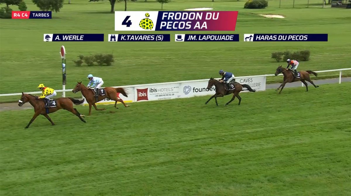 Déjà impressionnant lors de sa victoire, en débutant, dans le Prix Pierre & Benoît Vergez, à Dax, Frodon du Pecos l'a été tout autant le jeudi 05 juin dernier, à Tarbes-Laloubère, où il est parvenu à faire sien le Critérium des Jeunes à 37.5%, là aussi dans un excellent style, avec encore Antoine Werlé comme partenaire en piste. Longtemps avant-dernier, ce protégé de Kevin Tavares est venu librement, en pleine piste, peu après la sortie du tournant final, avant de faire très nettement la différence, et de s'imposer, une fois encore, sans coup férir. La deuxième place a été prise par Valse Aredienne (Carghese des Landes), une longueur et quart plus loin, et la troisième par Divine de Lenzac (Carghese des Landes), encore trois longueurs plus en retrait.
