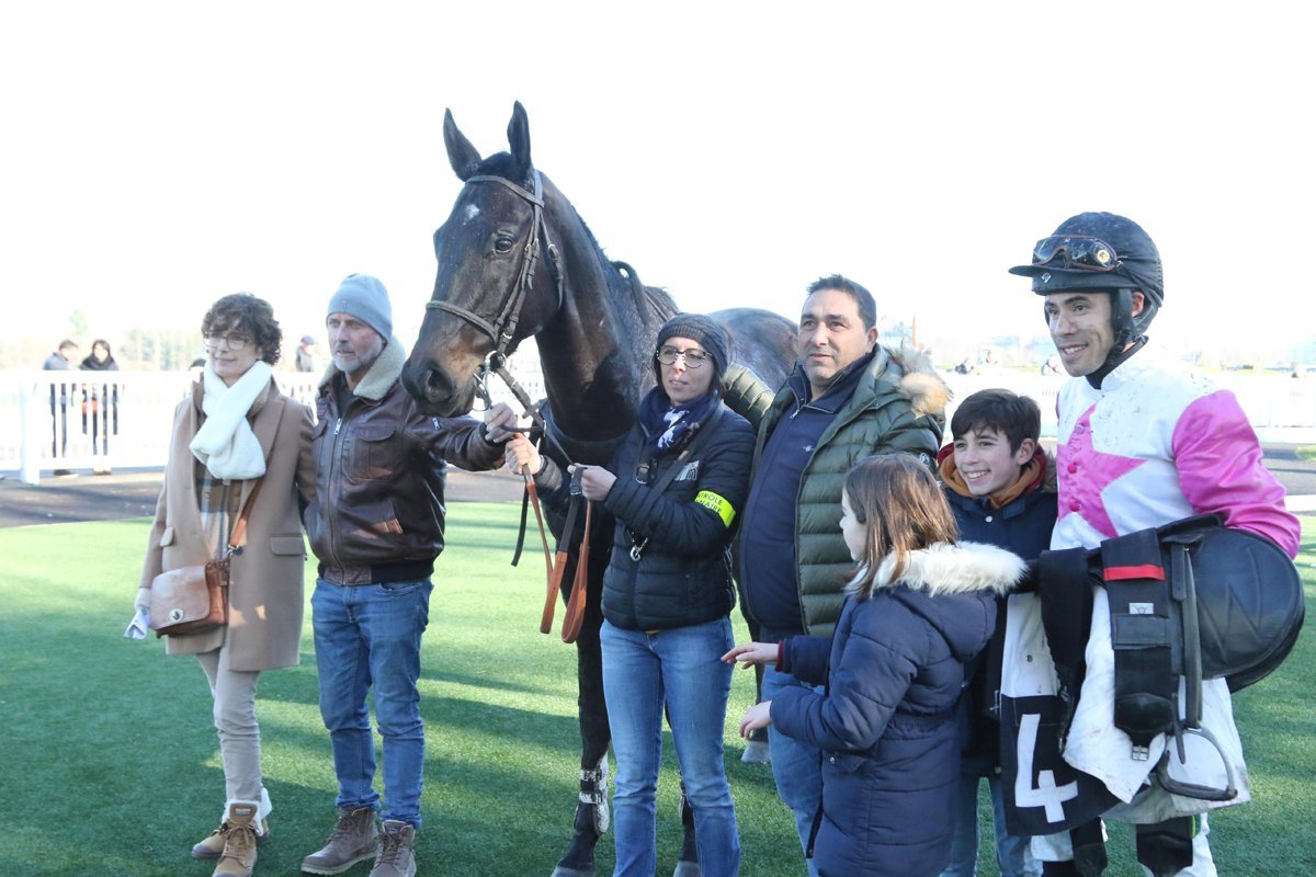 Korral, entouré de part et d'autres de ses éleveurs-propriétaires, Éric Leray et Claude-Olivier Corral, après son sacre dans le Prix des Pyrénées - Grand Steeple-Chase des 4 Ans, à Pau, le 31 décembre 2024 !