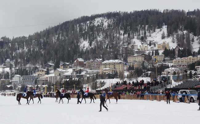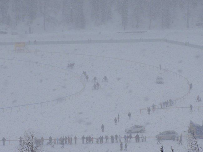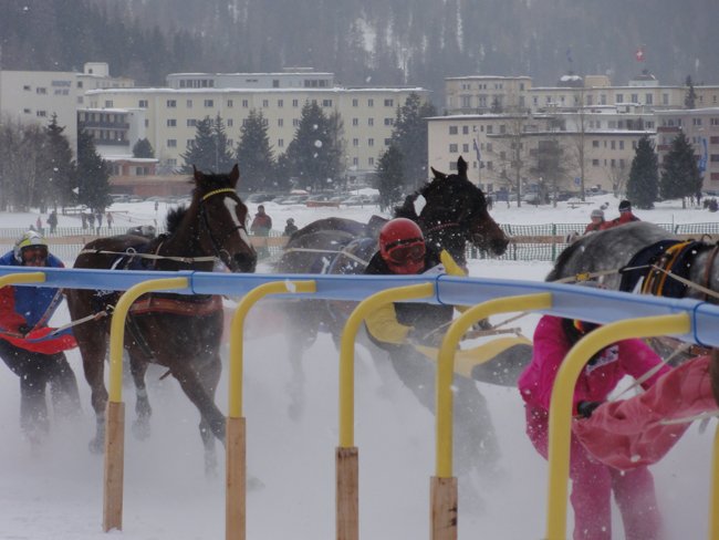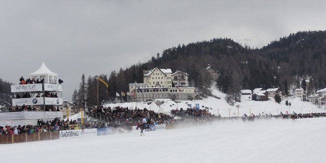 L'hippodrome de Saint-Moritz, unique au monde, est complètement fou, témoignage joyeux des délires des plus riches qui peuvent tout s'autoriser pour leur loisir, ce qui conduit parfois à des événements fantasques, loufoques, magiques. Cela se traduit souvent dans les courses qui sont depuis toujours un moyen d'expression des fantasmes des riches de ce monde. Le must pour un gars qui en a plein les fouilles, est de faire ce que personne d'autre ne peut faire, malgré son manque de condition physique. Organiser des courses de chevaux dans un lieu totalement improbable est un moyen très efficace pour épater la galerie. Les princes arabes font aujourd'hui ça dans le désert. Les anglais l'ont fait au 19e siècle à Hong Kong et dans de nombreuses autres colonies. Les suisses, afin d'offrir un loisir a priori inacessible aux touristes fortunées venus s'exercer aux sports d'hiver, ont ainsi eu cette idée folle d'utiliser la seul surface naturellement plate de la région : le lac qui gèle en hiver à l'altitude de 1800 m, et se couvre de neige. Tout est installé sur place à la dernière seconde, un peu comme sur les hippodromes marins en France en été, les bars à champagne en plus. Il y a même un tunnel qui part de la place principale entourée d'hôtels vraiment luxueux (pas kitchs) et qui mène directement à l'entrée du lac hippodrome.