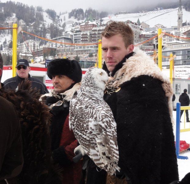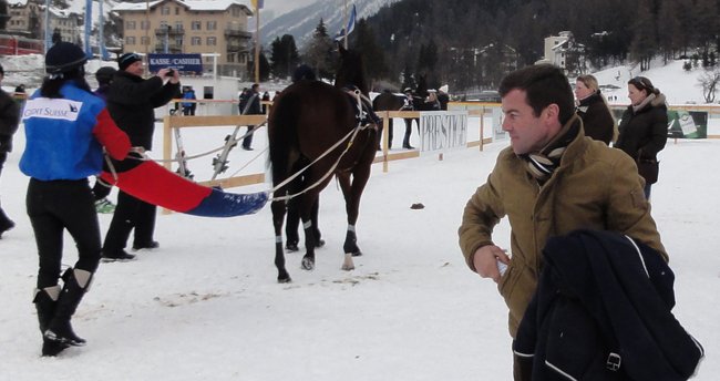 Mais il en tire une adrénaline exceptionnelle...à regarder une course en vrai, il y a de quoi ! En 2012, nous lui avions demandé avant la course de nous faire le guide, sur les conseils de Denis Roux, journaliste suisse bien connu sur Equidia. Il courait ici pour la 1e fois avec une certaine Mombasa qui décrouvrait les courses sur la neige, préparée pour l'occasion par Peter Schiergen. Le crack-entraineur allemand, toujours aussi modeste, arrivait pourtant à Saint-Moritz en Guest star, tout auréolé de son récent succès avec Danedream dans le Prix de l'Arc de Triomphe 2011. Il n'avait jamais engagé un cheval à Saint-Moritz. Pour faire plaisir aux propriétaires historiques de Gestut Bona, il a préparé une bonne jument déjà placée de Listed, Mombasa. Pour être sûr qu'elle supporte le harnachement du ski-joring, il l'a passé aux longues rênes à l'écurie.