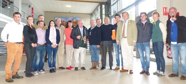Michel de Gigou, Président des AQPS Ouest pose aux côtés de ses sponsors du jour Francois et Jessica Jereczek (ostéopathes), Joel Poirier représentant le Haras du Chêne, Vincent Le Roy, Pascal Noue du Haras de la Hetraie qui remettait des saillies de Kapgarde et Great Pretender, Aurélien Kahn, Aurore Ramet et Christophe Hallope