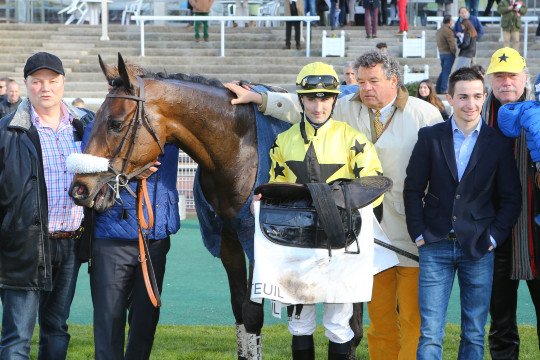 Tout le monde était présent pour le retour victorieux à Auteuil du lauréat du Grand Steeple-Chase de Paris 2014, Storm of Saintly : Jeannot Andt, son propriétaire, et Vincent Cheminaud, le jockey à l'époque du sacre.