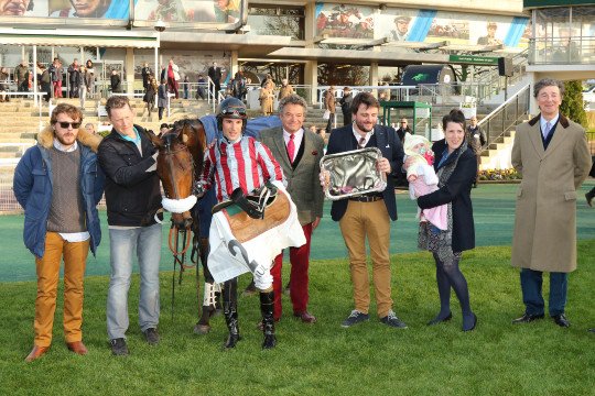 L'occasion d'une 4ème photo dans le temple de l'obstacle, pour Verdure des Obeaux, avec Thomas Beaurain et ses éleveurs-propriétaires-entraîneurs.