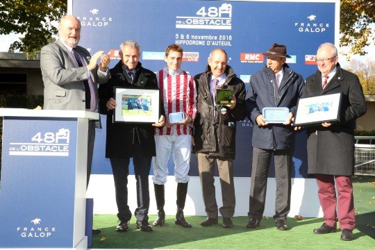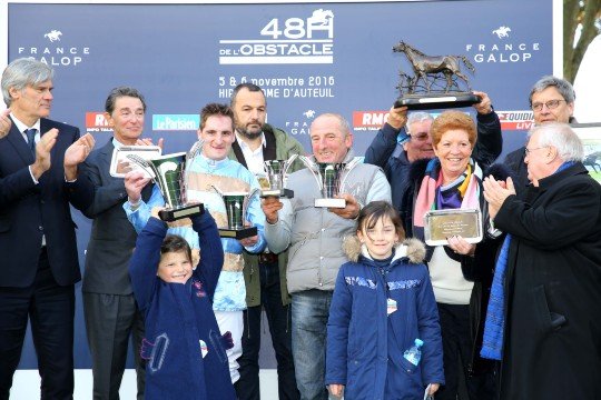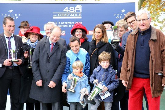 Un podium enthousiaste pour M.François Nicolle qui remporte ici le 1er Gr.1 de sa carrière d'entraîneur