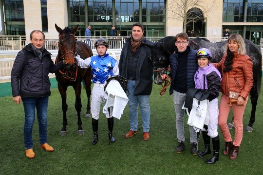 Benjamin Legros, avec le gagnant, Late Comer et Jacky Nicoleau, et le second, Senator Frost et Delphine Santiago