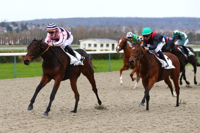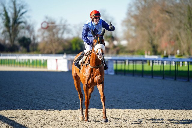 Samedi à Chantilly : la casaque ML Bloodstock que l'on a plus l'habitude de voir en obstacle, brille ici avec Simaruba et Ludovic Boisseau