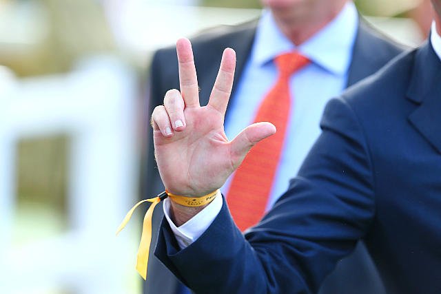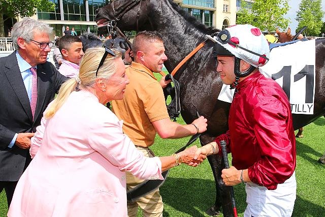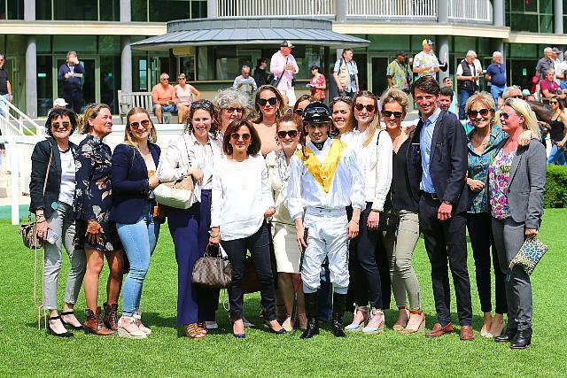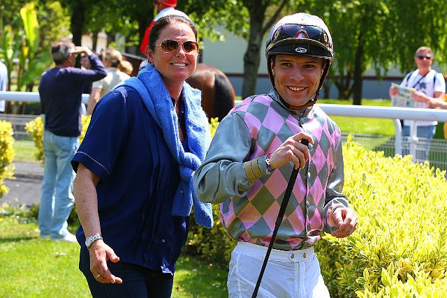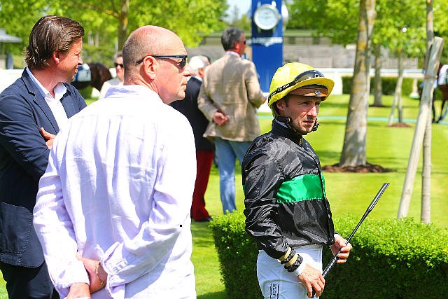 Mardi à Chantilly : après sa victoire dans le Quinté avec Marrakech Moon, Mickael Barzalona est félicité par Lady Bamford