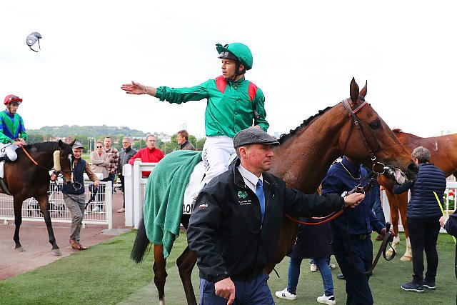 Lundi à ParisLongchamp : Maxime Guyon félicité par Philippe Demercastel après la victoire de son élève Fort Payne dans le Prix Du Palais-Royal(Gr 3).