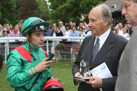 S.A. Aga Khan et Christophe Patrice Lemaire après le succès de Sarkiyla dans le Gr.3 Prix de Lieurey