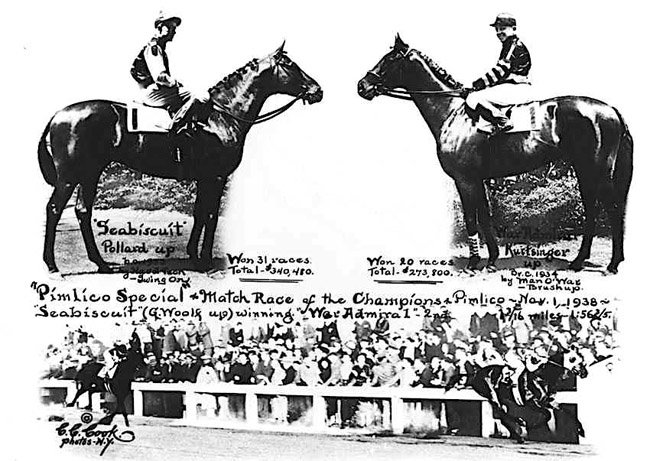 Après moult tergiversations, reports et aléas divers, les entourages des champions Seabiscuit et War Admiral finissent par se mettre d’accord : le match opposant les deux meilleurs performers d’Amérique du Nord aura bien lieu, et ce sera sur les 1900m dirt de l’hippodrome de Pimlico (Baltimore), le 1er Novembre 1938. La course, baptisée Pimlico Special et dont l’édition inaugurale avait été remportée l’année précédente par War Admiral, attirera une foule de 40.000 personnes et sera suivie par plus de quarante millions d’auditeurs à la radio: le match du siècle !