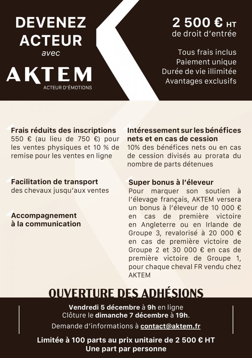 - Super bonus à l’éleveur : afin de soutenir l’élevage français, AKTEM versera un bonus à l’éleveur en cas de première victoire en Angleterre ou en Irlande de Groupe 2 de 20 000 €, revalorisé à 30 000 € pour une première victoire de Groupe 1 pour tout cheval vendu chez AKTEM