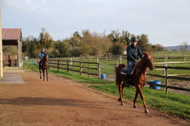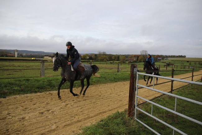 Laureen a démarré son activité en 2011. Les premiers jours de débourrage, les chevaux se rendent à la piste, seul, et ensuite, ils travaillent par lot de 2 ou 3. Les poulains sortent quotidiennement au marcheur, pendant environ 45' avant de se rendre en piste.