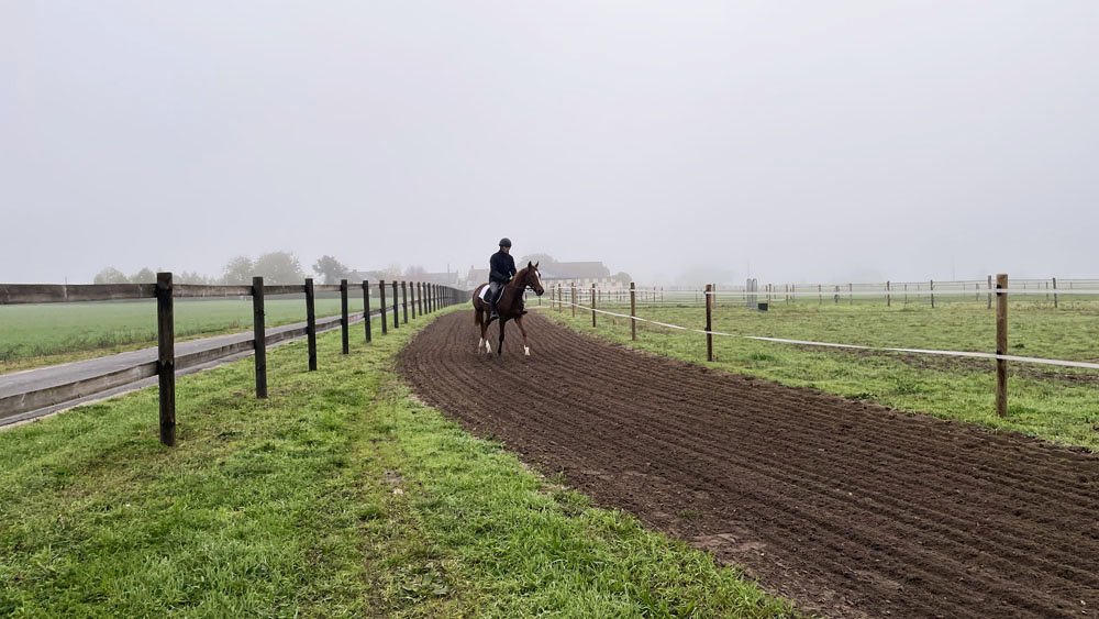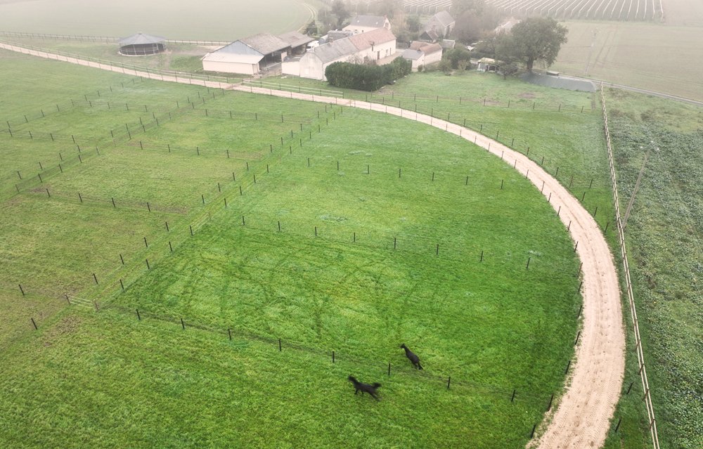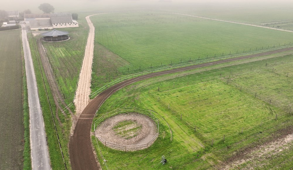 Deux pistes ont été tracées: un grande piste de 850 m avec dénivelé, et une piste ovale de 600. A l'intérieur de la grande piste 18 paddocks de 25mx25m ont été cloturés. Avec un tel nombre, les chevaux peuvent sortir tous les jours dans des paddocks différents qui peuvent aisi rester verts. Par ailleurs, 2 grands paddocks de 6000 m2 sont sont prévus pour les chevaux de repos, qui alternent leurs journées entre le box et le pré.